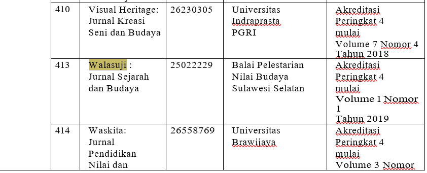 Walasuji : Jurnal Sejarah dan Budaya is an open access, a peer-reviewed journal published by Balai Pelestarian Nilai Budaya Sulawesi Selatan. We publish original research papers, review articles and case studies on the latest research and developments in the field of : oral tradition; manuscript; customs; rite; traditional knowledge; traditional technology; art; language; folk games; traditional sports; and history. Walasuji : Jurnal Sejarah dan Budaya is published twice a year and uses double-blind peer review. All submitted articles should report original, previously unpublished research results, experimental or theoretical that are not published and under consideration for publication elsewhere. The publication of submitted manuscripts is subject to peer review, and both general and technical aspects of the submitted paper are reviewed before publication. Manuscripts should follow the style of the journal and are subject to both review and editing. Submissions should be made online via Pangadereng journal submission site. Accepted papers will be available on line and will not be charged a publication fee. This journal is published by Balai Pelestarian Nilai Budaya Sulawesi Selatan Direktorat jenderal Kebudayaan Republik Indonesia, Kementerian Pendidikan Dan Pendidikan.